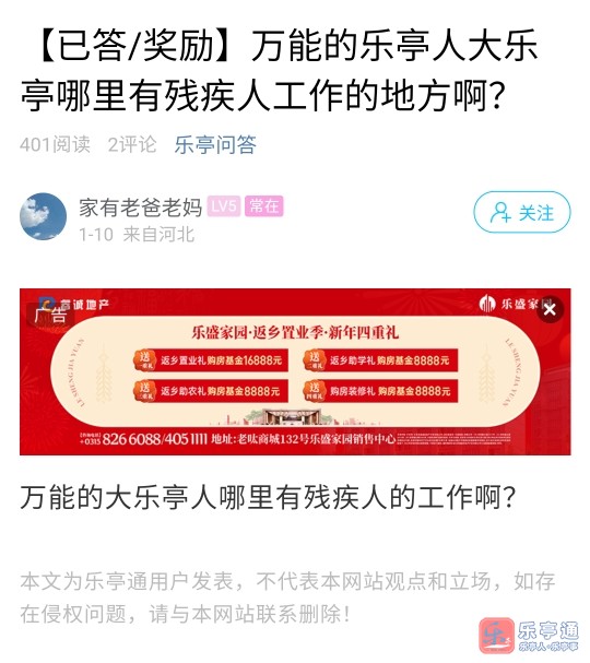 第3轮:互动星期天通友问答环节!乐亭哪里有残疾人工作的地方啊?
